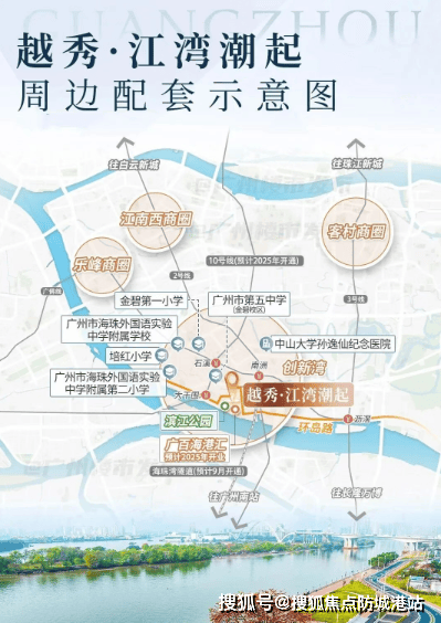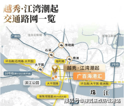 越秀江湾潮起位于海珠区,地理位置得天独厚。直线距离约 650 米处(百度地图)便是开通的 10 号线大干围站,这条串联天河、越秀、海珠、荔湾四大组团中心区的轨道 “加密线”,可轻松抵达滨江东、五羊邨、珠江新城、体育西等市区核心板块,为居民的日常通勤和商务出行提供了极大便利。附近的海珠湾隧道(在建)预计今年开通后,到广州南站通勤仅需约 15 分钟,进一步拓展了居民的出行范围。此外,项目门口的环岛路(石岗路 - 大干围路段)今年也会开通临时道路贯通,将大大提升整个板块的通行效率,使居民能够更加顺畅地穿梭于城市之间。