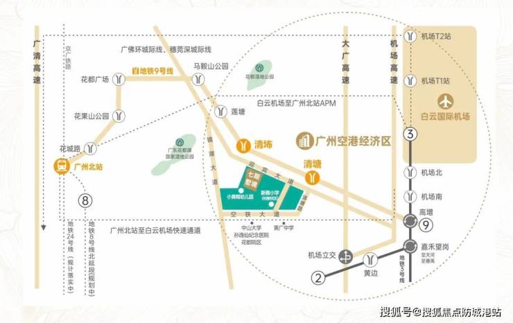 项目坐落于花都区新机场板块迎宾大道3号,属于空港核心发展区域,享受板块规划红利。交通出行便捷度极高,据*高德地图实测*,距离最近地铁站步行仅670米,约8分钟可达,周边拥有2个地铁站、120个公交站点,150米范围内即有合和新城公交站,途径701a路、701路、707路等公交路线,707路可直达中恒商业广场,花22路可至清布中学。自驾出行同样便利,距离机场高速公路约5公里、大广高速约5.1公里,通过主干道可快速衔接广州各区域,30分钟内可达白云机场,40分钟左右抵达天河CBD,满足通勤与出行需求。