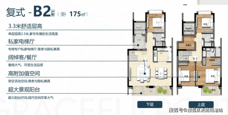 复式户型:项目还推出164㎡、167㎡、175㎡、183㎡等多种复式户型,复式户型采用上下两层设计,空间层次感强,能够实现功能分区的最大化。上层可作为休息区,配备卧室和卫生间,保障居住的私密性;下层可作为公共活动区,包括客厅、餐厅、厨房等,适合家庭聚会和日常活动;同时,复式户型还拥有挑高客厅和超大露台,彰显品质感和奢华感,为业主提供独特的居住体验。