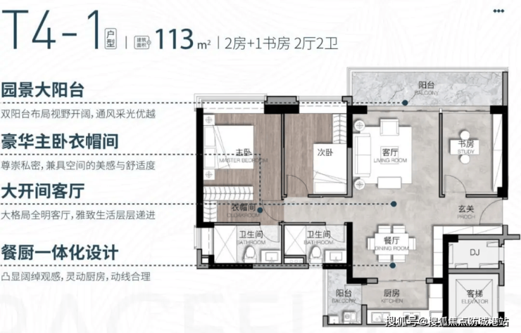 113㎡两房+1书房两厅两卫(平层):该户型布局紧凑合理,空间利用率高。客厅采用大开间设计,连接观景阳台,采光通风效果极佳,推窗即可欣赏中央园林美景;书房可根据家庭需求灵活改造为儿童房或客房,增加空间的实用性;两个卫生间均采用干湿分离设计,保持室内干燥整洁;厨房采用U型布局,操作空间充足,方便日常烹饪。