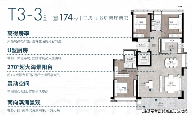 174㎡三房+1书房两厅两卫(平层):该户型空间宽敞舒适,注重居住的品质感。客厅采用大横厅设计,视野开阔,彰显大气;书房空间宽敞,可作为家庭图书馆或办公空间;主卧套房配备独立卫生间和超大衣帽间,满足主人的品质需求;阳台面积宽敞,可打造为休闲区或种植区,享受惬意的居家时光。