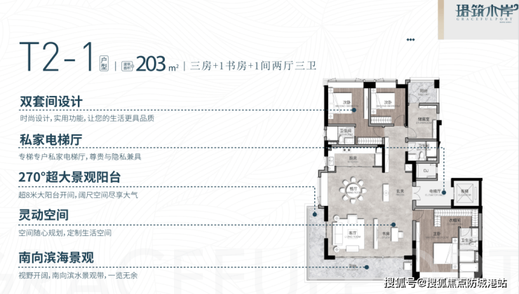 203㎡三房+1书房+1间两厅三卫(平层):该户型为奢居大平层,空间尺度极致,居住体验奢华。多房间设计能够满足大家庭的居住需求,同时保证每个家庭成员的私密性;三个卫生间设计,避免了高峰期使用拥堵的问题;客厅与餐厅相连,形成超大公共活动空间,搭配全景阳台,采光通风极佳,园林美景一览无余;主卧套房设计奢华,配备独立卫生间、衣帽间和观景露台,尽享尊贵生活。