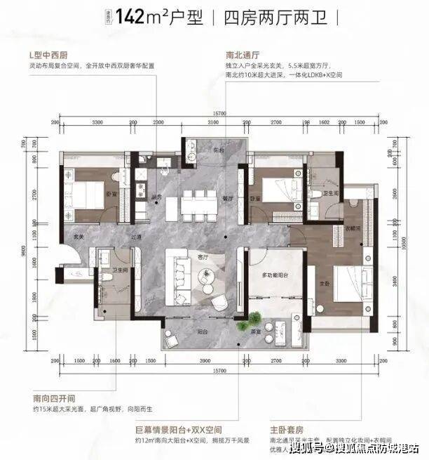 142㎡户型:专梯专户设计,定制私属归家路线,彰显尊贵与私密。超大的空间尺度,可进行个性化的豪华布局,满足更高品质生活需求。无论是设置独立书房、健身房,还是打造豪华衣帽间,都能轻松实现。