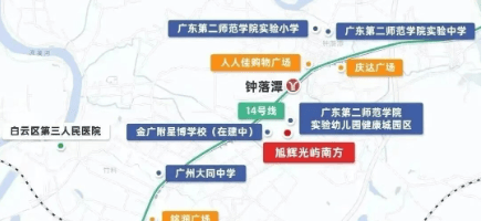 旭辉光屿南方位于地铁14号线钟落潭站附近,距离站点直线距离约850米,交通十分便利。通过地铁14号线,仅需五站即可到达嘉禾望岗站,换乘2号线或3号线后可直达白云新城及其他重要区域。此外,自驾出行也非常方便,周边有多条高速公路如华南快速、京港澳高速等,为居民提供了便捷的城市内外交通网络。