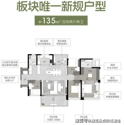 135㎡户型四房两厅两卫:南北通透双阳台,5.25 米大宽厅搭配 5.45 米大阳台,主卧开间约 3.6 米,空间舒适度拉满,实用率 138%,满足高端改善需求。