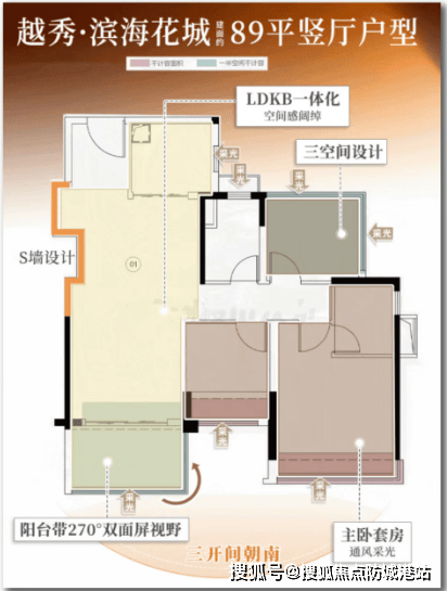 约89㎡三空间带主套:拥有更开阔的南向采光面,舒适度高。