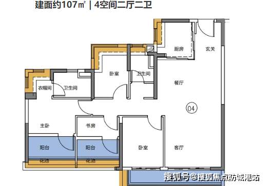 四个卧室布局合理,均为南向或东南向,采光充足,空间大小适中,其中主卧为套间设计,配备独立卫生间和飘窗,私密性强;另外三个卧室可作为儿童房、老人房或书房,灵活适配家庭结构变化;两个卫生间均为干湿分离设计,使用便捷;户型赠送面积大,使用率高达105%,额外增加了居住空间,让107㎡的户型拥有超越同面积段的居住体验。