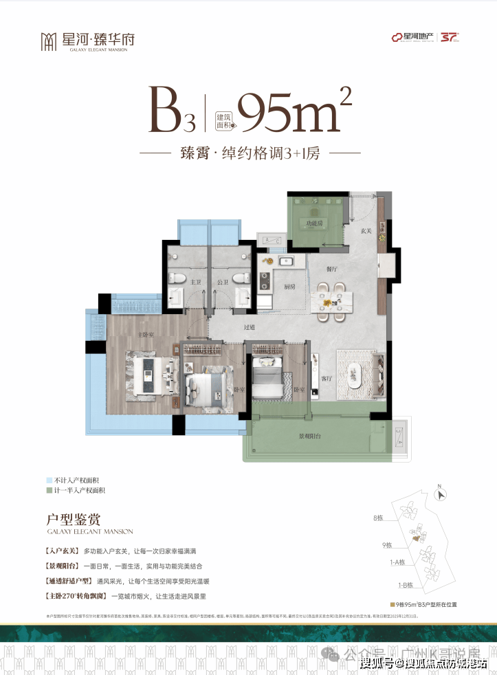 建面约95㎡户型为3+1灵动空间设计,得房率约100%,在85㎡户型的基础上增加了灵动空间,适配成长型家庭的居住需求。该户型同样为新规产品,遵循新规设计标准,层高达到3.1米,符合2025年住建部《住宅项目规范》要求,提升了室内空间的舒适度。户型采用入户飘窗玄关设计,增加了入户区域的使用空间,可用于摆放鞋柜、收纳柜等,方便业主入户换鞋、收纳物品,提升入户体验。主卧配备270°飘窗观景设计,可俯瞰社区景观与山体景色,增加了室内使用空间,也为业主提供了休闲观景的区域。
