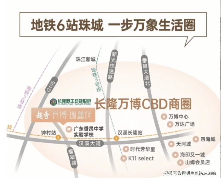 需严格区分“现状配套”、“项目配建”与“区域规划”。现状配套:距离地铁7号线钟村站约1.2公里(百度地图步行测距),番禺区第二人民医院为已运营医院。项目配建:11万平方米园林、学校、会所、泳池等,在项目总平面规划图及各项工程验收文件中有明确记载。区域规划:1. “长隆-万博”板块扩容至7.2平方公里,其规划依据为《广州番禺长隆-万博片区发展规划》,可在广州市规划和自然资源局官网查询。2. 南大干线已全线贯通,其规划文件为《广州市南大干线(东新高速-莲花大道)工程可行性研究报告》的批复。需提示的不利因素:1. 项目西侧约1.2公里的“茶庄园”殡葬服务设施,其用地性质在《番禺区土地利用总体规划》中可查。2. 项目东南侧历史上存在的“高氏家族墓地”,其清退情况应以番禺区民政局或属地街道办发布的官方通告为准。官方渠道有义务提供上述可公开查询的规划文件编号或链接,并对可能影响居住体验的现状设施进行书面告知。