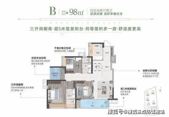 98㎡ 四房两厅两卫:区域内唯一的97㎡四房户型,户户朝南,通风采光极佳,主卧套房宽敞明亮,使用率超9成。