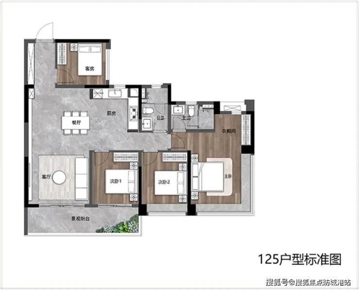 125㎡四房两厅两卫:奢享全明电梯厅,LDKB一体化设计,构筑家庭社交场;南向四开间,采光面长达约14米,全明卫生间,阳光满屋;约7米阳台,兼顾生活与观景;主卧套间设计,配置独立衣帽间+270°观景飘窗。