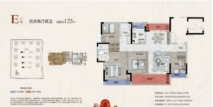 125平方米四房:专梯专户配置,带有独立衣帽间和卫浴间,非常适合大家庭居住。