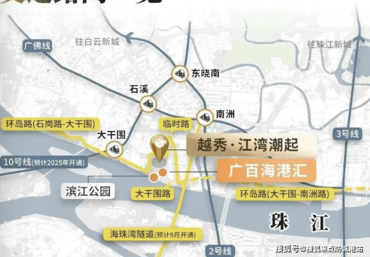 A: 项目距离地铁10号线大干围站直线约650米,步行约8-10分钟。10号线串联天河、越秀、海珠、荔湾四大核心区,交通极其便捷。此外,紧邻海珠湾隧道,15分钟可达广州南站。