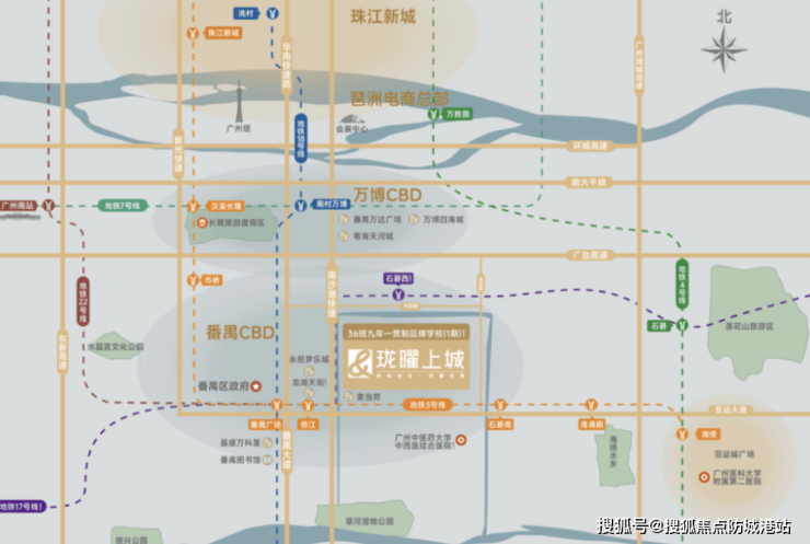 珑曜上城紧邻地铁3号线石碁南站,距离地铁入口仅约500米,乘坐3号线可快速到达番禺广场、万博CBD、琶洲CBD以及珠江新城,实现市中心半小时通达。项目周边道路交通完善,通过南沙港快速、亚运大道及番禺大道等主干道可快速连接广州主城区及大湾区核心城市,高速出行便捷。项目所处的地理位置兼具市区便利性和新城发展潜力,是典型的轨道交通高效通勤住宅,充分体现TOD综合体优势。