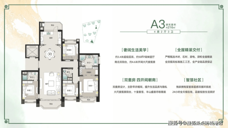 四房户型包括 214㎡和 216㎡,2 厅 3 卫设计: