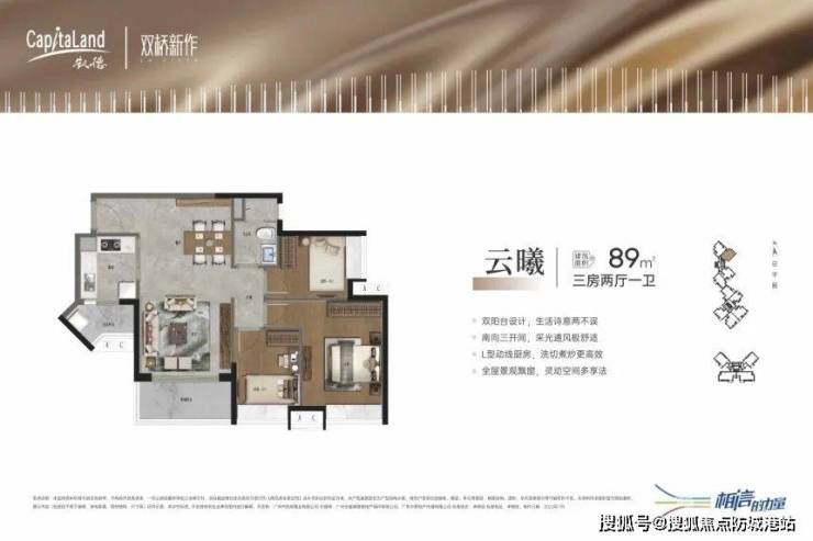 89㎡户型:三开间朝南,采光优良,双阳台兼具实用与观景功能。