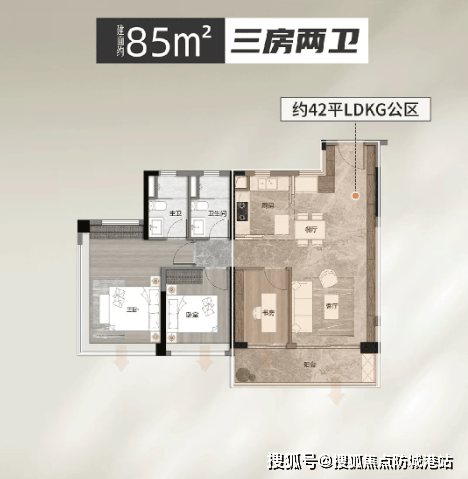 85平方米三房两卫:带有6米大阳台,空间感十足,适合年轻家庭。