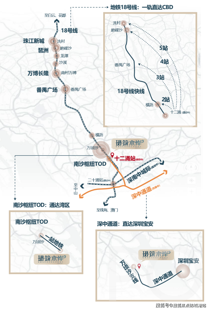 珺筑水岸构建了“双轨 + 一桥 + 多高速”的立体交通网络。项目距离深中通道广州出入口仅2公里,可快速连接深圳前海,极大提升与深圳的交通便捷性。同时,距离广州地铁18号线十二涌站约1.2公里,18号线是全球最快的高速地铁之一,广州段预计2025年正式通车,届时5站可达珠江新城CBD,通勤效率极高。此外,周边还规划有湾区首条时速160km/h的地下轨道交通,将实现广州、中山、珠海一线互通,多维交通体系让居者在繁华与静谧间自由切换。