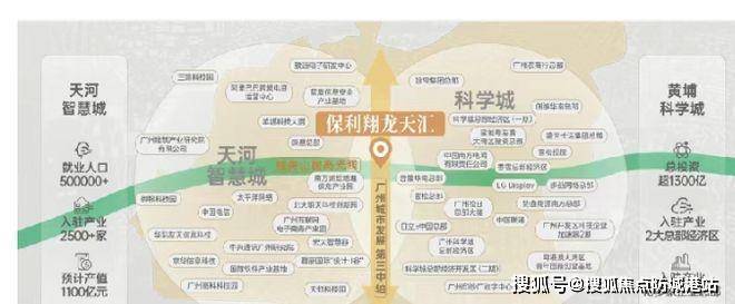 保利翔龙天汇坐落于广州第三发展中轴线 “科技创新轴” 上,处于天河智慧城与黄埔科学城双城交汇之处。此中轴线以琶洲为核心,北起中新广州知识城,南抵广州大学城,汇聚金融总部、人工智能、数字经济及智能制造等产业,未来产业成熟后,承载的 GDP 预计超万亿元,对广州经济发展意义重大。