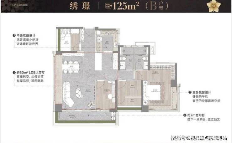 在110㎡的基础上,125㎡户型进行了全面的升级。最大的亮点在于引入了“双厨”概念,中西厨分离的设计让烹饪场景更加灵活多样。中式厨房封闭操作,隔绝油烟;西式岛台开放互动,增加情趣。餐厅与客厅一体化设计,形成了阔绰的LDK大方厅,极大地延伸了家庭活动空间,无论是家庭聚会还是孩子玩耍,都游刃有余。南向主卧套房带独立卫浴,保障了主人的私密性和尊贵感。这款户型在功能性和舒适度之间找到了完美的平衡点,适合对生活品质有更高要求的家庭。