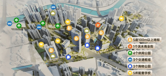 项目内部规划了约60万㎡的高端商业配套,包括星级酒店、主题购物公园及滨水商业街等,满足居民日常生活的各种需求。同时,拥有四大公园环绕,提供丰富的户外活动空间,提升生活质量。