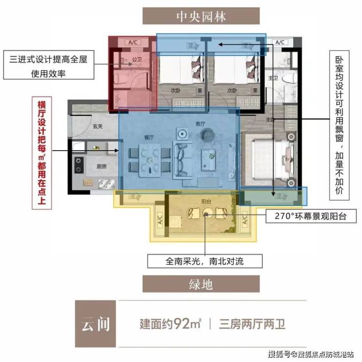 【92㎡三房二厅二卫】:该户型为全南采光户型,整体布局方正,南北通透,通风效果极佳,卧室全飘窗设计,加量不加价,居住舒适度高。客厅宽敞明亮,连接南向阳台,可俯瞰社区园林景观,部分户型可远眺白云湖,视野开阔;餐厅与客厅相连,形成一体化设计,增加了室内活动空间,方便家人聚餐、休闲。三个卧室均朝南,采光充足,主卧带有独立卫生间,保障业主的私密性,同时主卧飘窗设计,可欣赏窗外风光,提升居住体验;另外两个卧室大小适中,可作为儿童房、书房或客房使用,灵活性高。两个卫生间均采用干湿分离设计,使用便捷,避免潮湿困扰,适合三口之家或四口之家居住,兼顾实用性和舒适度。
