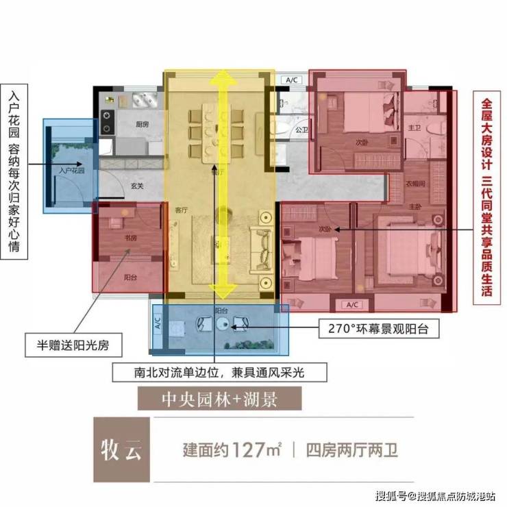 【127㎡四房二厅二卫】:该户型为南向四开间设计,全屋极致采光,每个房间都能获得充足的自然光,居住舒适度极高。户型整体方正,空间宽敞,布局合理,动静分离,公共区域宽敞明亮,适合家人聚餐、休闲娱乐;客厅连接南向大阳台,阳台宽敞,可俯瞰白云湖全景,视野开阔,是欣赏湖景的绝佳位置。四个卧室大小适中,均带有飘窗,主卧带有独立卫生间和衣帽间,私密性强,居住舒适;另外三个卧室可作为儿童房、书房、客房使用,灵活性高,满足多人口家庭的居住需求。餐厅与客厅相连,形成一体化设计,同时连接北向阳台,实现南北对流,通风效果更佳;厨房设计合理,操作空间充足,方便日常烹饪。两个卫生间均采用干湿分离设计,使用便捷,适合高端改善型家庭居住,彰显居住品质。