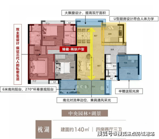 【140㎡四房二厅二卫】:该户型为四房双主套设计,是项目的高端户型,6米大阳台,望湖极致景观面,居住舒适度和私密性极佳,适合高端改善型家庭。户型整体方正,空间宽敞,布局合理,南北通透,通风采光效果极佳;客厅宽敞大气,连接6米宽南向阳台,可全方位欣赏白云湖风光,视野开阔,阳台可作为休闲、观景空间使用,彰显居住品质。四个卧室均带有飘窗,空间宽敞舒适,其中两个卧室带有独立卫生间,形成双主套设计,保障业主的私密性,适合多代同堂居住,长辈和年轻人可各自拥有独立的私密空间,互不干扰。餐厅与客厅相连,形成一体化设计,空间宽敞,适合家人聚餐和朋友聚会;厨房设计科学,操作空间充足,同时配备储物空间,方便日常烹饪和储物。两个公共卫生间均采用干湿分离设计,使用便捷,此外,户型还带有独立的玄关和储物间,增加了空间的实用性,整体户型兼顾居住舒适度、私密性和实用性,彰显高端居住品质。