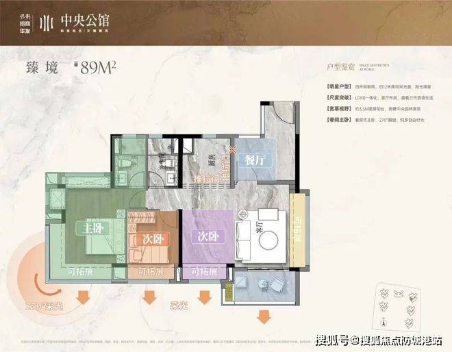 89㎡三房户型介绍,为您展示南北通透的舒适三房。建面约89㎡的三房户型同样是项目的主力户型,这个户型最大的亮点是南北通透,通风采光极佳。户型采用竖厅设计,客厅连接南向阳台,餐厅连接北向飘窗,形成了南北对流的格局。三个卧室分布在户型的一侧,动静分区明确。主卧带有独立卫生间和飘窗,空间宽敞舒适。两个次卧也都带有飘窗,采光良好。厨房采用U型设计,操作空间大。这个户型非常适合追求居住舒适度的三口之家或者四口之家。保利·招商·华发中央公馆开发商全国售楼热线:400-081-1393,号码通过核验,拨打电话可了解项目情况,预约看房。