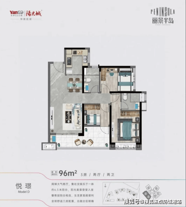 阳光城·丽景半岛由实力房企阳光城集团与广州逸涛万国房地产有限公司联合打造,总占地面积约4.6万㎡,总建筑面积高达32.8万㎡,规划10栋高层住宅、3栋公寓及1所幼儿园,是一个集居住、商业、教育、休闲于一体的百万方城市综合体。