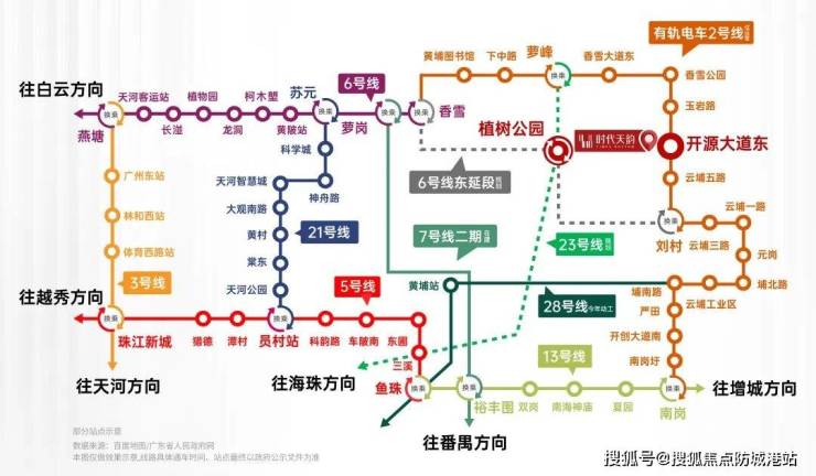 虽然距离最近的地铁站香雪站大约有3.8公里,但时代天韵小区门口就有黄埔有轨电车2号线开源大道东站,业主可以乘坐有轨电车前往香雪站换乘地铁6号线,直达天河、海珠、越秀等地。此外,规划中的地铁6号线东延段和23号线将在附近的植树公园站交汇,进一步提升该地区的交通便利性。自驾出行也非常便捷,周边有三纵五横环城高速路网,能够快速抵达城市的各个重要区域。