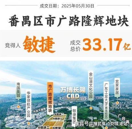 2025年5月30日,敏捷集团以总价约33.17亿拿下番禺钟村隆辉地块,楼面价1.3万/平方米。该地块共分割为4宗宅地,分别是A地块一、A地块二、D地块一和D地块二。作为深耕广州番禺多年的本地民企标杆,敏捷集团此次拿下的地块不仅毗邻其总部,更承载着打造一座城市封面作品的重任。敏捷·万博金湖壹号将充分利用其优越的地理位置和丰富的自然资源,成为广州南区的新亮点。
