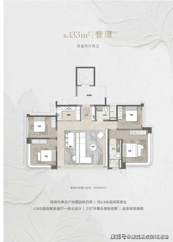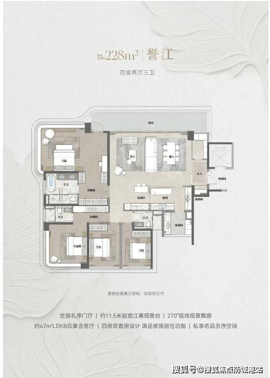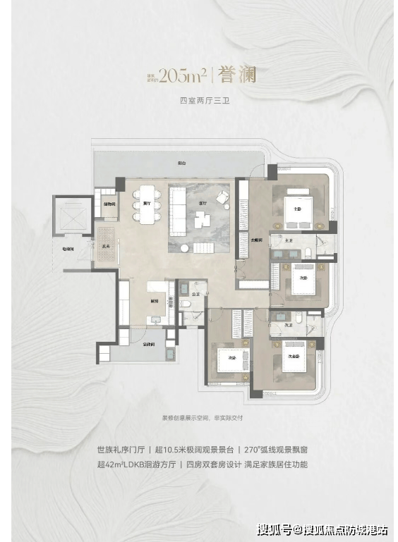 产品力是能建天誉府最核心的竞争力,其户型设计堪称南沙新规下的“教科书级”范本。项目主推建面约133至228平方米的大平层户型,通过创新的空间布局,实现了约100%-102%的超高使用率。建面约133平方米的四房户型,采用纯南向园景单边户设计,拥有6.8米的超阔观景台,LDKB一体化设计让客餐厅空间通透大气,兼顾了实用性与景观体验;建面约205平方米的四房户型,以42平方米的洄游方厅为核心,搭配10.5米的奢阔观景露台,极大地强化了空间的通透感与互动性;而建面约228平方米的终极改善户型,更是配备了约11.5米的超宽江幕观景台与约67平方米的LDKB云峯会客厅,双套房设计完美满足了家族居的需求,主卧开间可达6.8米,奢华感十足。所有户型均采用0.36的高窗地比与270°环幕视野设计,将横沥水道的壮丽景色毫无保留地引入室内,真正做到了“引景入室,天人合一”。