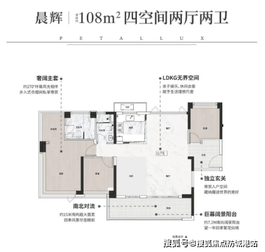 建面约108㎡户型尺度感极佳,同样做到南北对流,拥有7.2米长的大景观阳台,能够俯瞰社区中央园林景致,视野开阔。大面积主卧可轻松摆放1.8米大床,搭配独立衣帽间,满足业主对品质生活的追求;户型整体灵活性强,可根据家庭结构变化调整空间布局,适配长期居住需求。