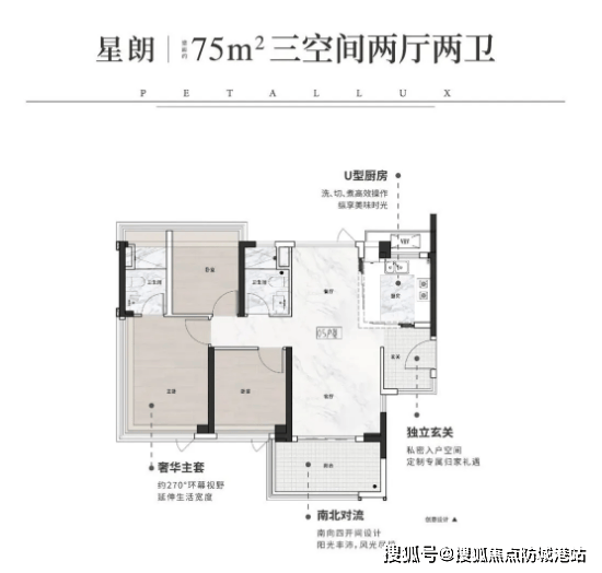 建面约75㎡户型,做到了三空间两厅两卫的极致布局,打破了市面上同面积段户型的局限,实际居住体验不输90㎡+户型。户型采用独立玄关设计,保障居住私密性;主卧配备270°飘窗,视野开阔,采光通风俱佳;同时实现南北对流,室内空气流通顺畅,让小空间也能拥有大舒适。