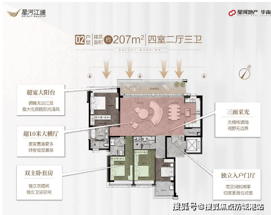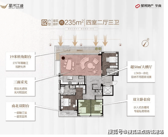 星河江缦的主力户型为 179-235㎡四房,整个小区共 7 栋楼,采用半围合式、纯板式设计,且实现专梯专户,保障业主生活私密性。其中 1、2、3 栋面积段均为 179㎡;4 栋为 211㎡,是项目总层最高的一栋,共 30 层,南北都能望江,白天鹅楼栋也可映入眼帘,5 层以上为住宅区,1-4 层为业主会所,配备健身房、高尔夫球练习室、茶室、共享厨房等功能区;6、7 栋为 207㎡;5 栋为 235㎡,专梯专户设计,距离江边仅 90 米左右,是项目主推户型,货量最少,仅 30 套。所有户型均为双套房设计,还具备 LOW-E 玻璃、LDKB 一体化、超宽大阳台、三卫浴空间、高得房率等亮点,目前实体样板房已开放,首层酒店式入户大堂以奥地利灰石材彰显气派感,还有五星级地下车库与地下奢装大堂,尽显品质。项目预计 2024 年 9 月底 10 月政府验收,合同 2024 年 12 月收楼,准现房属性让购房者无需久等。