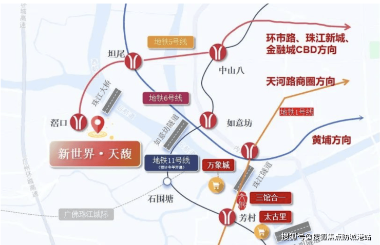 滘口片区作为白鹅潭CBD的重要组成部分,近年来承载了广州西进战略的核心任务。新世界天馥正位于滘口核心位置,紧邻地铁5号线滘口站,直线距离仅约400米,步行约6分钟即可到达。地铁5号线作为广州的东西向大动脉,从项目出发12站即可直达珠江新城,无需换乘,通勤效率极高。同时,项目还可通过换乘6号线与11号线,快速抵达越秀、天河等核心区域,自驾方面更有珠江大桥及多条隧道环绕,交通路网发达。