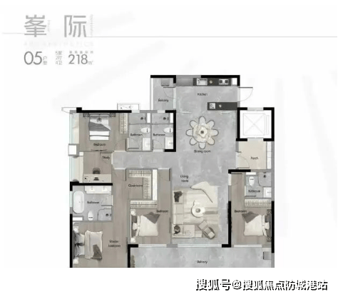 建面约218㎡五房:大尺度空间设计,外瞰山湖景观,居住舒适度极高,彰显尊贵身份,适合追求高品质生活、家庭成员较多的家庭。