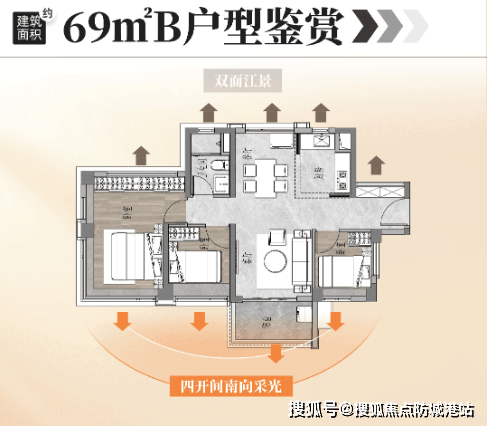 69㎡南北流三房:尽管面积较小,但通过巧妙的空间布局实现了南北对流,并且拥有双面江景。客厅开间约3.15米,若打通一个卧室,则可形成约20平方米的大方厅,主卧面积约17平方米,带有L型飘窗,可眺望白鹅潭城市景观。