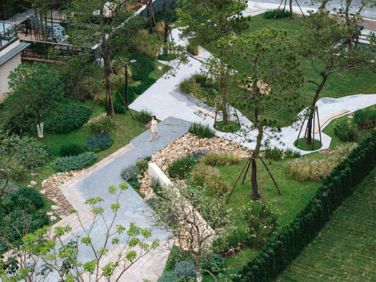 全冠移植的朴树,保留了完整的树冠与根系,能够快速适应新的环境,在入住时就已经形成了成熟的景观,为入口处提供了自然的仪式感。 从巴马村移植的树木,也为项目带来了长寿之乡的生态寓意,契合了居者对健康长寿生活的向往,为居住增添了美好的寓意。 当前市场中,越来越多的项目开始关注居住的精神内核,这类带有文化寓意的景观设计,也能够更好的满足高阶客群的精神需求。