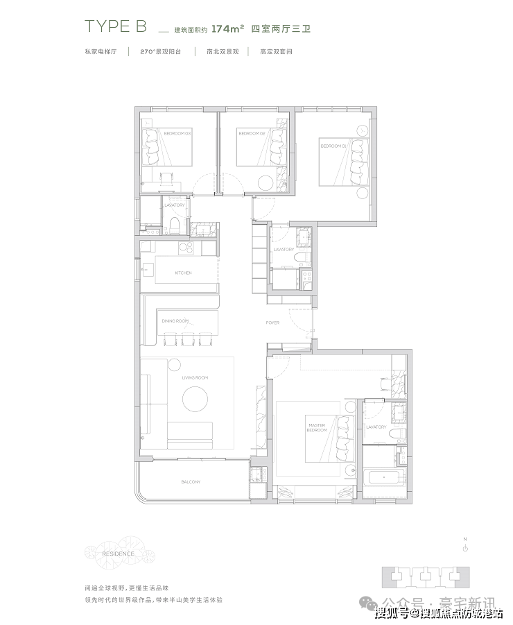 约174平方米户型:此户型的一个显著特点是拥有一个270度的观景阳台,极大拓宽了景观视野。通常规划为高定双套间设计。
