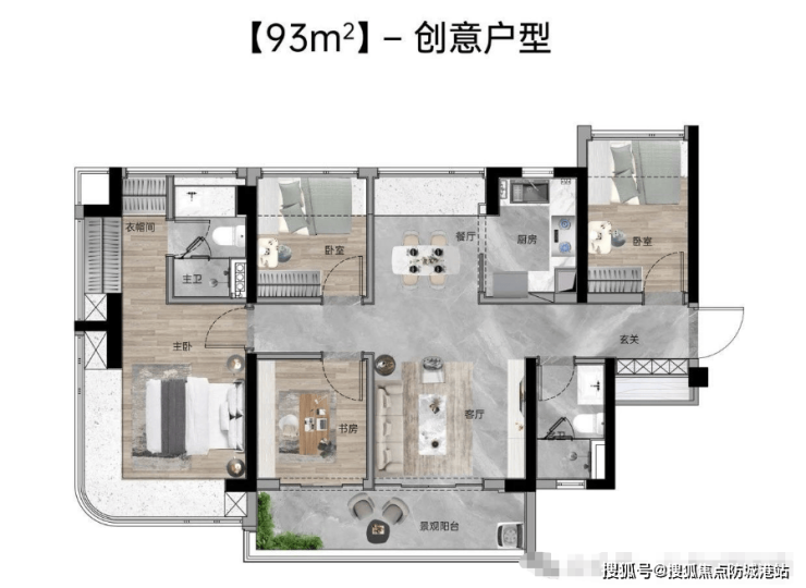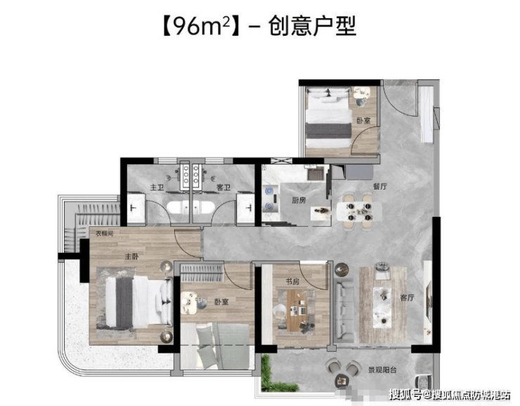 96㎡四房两厅两卫:西南向,约5.7米面宽瞰山阳台,主卧270°弧形玻璃幕窗,使用率达到100%。