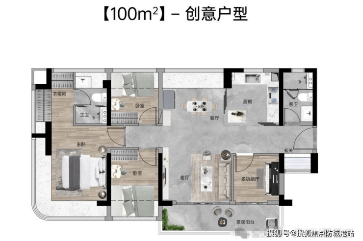 100㎡四房两厅两卫:西南向,南北通透,约6.1米巨幕阳台,主卧270°弧形玻璃幕窗,使用率达到109%。