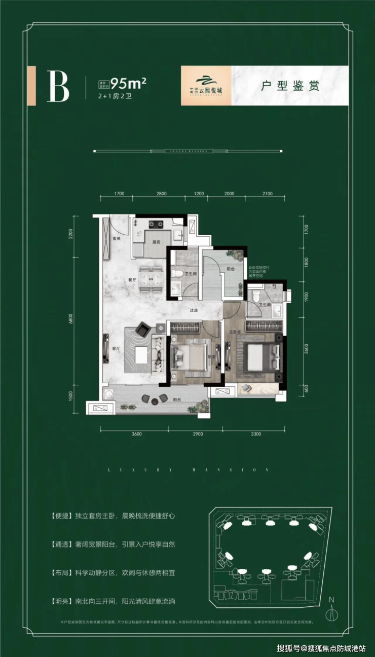 【95/97㎡:三房两卫】主力型产品,南北通透,竖厅设计,宽绰阳台,实用率高。最小面积三房带主套,正对中心园林,超大阳台,视野开阔,适合三代同堂 。