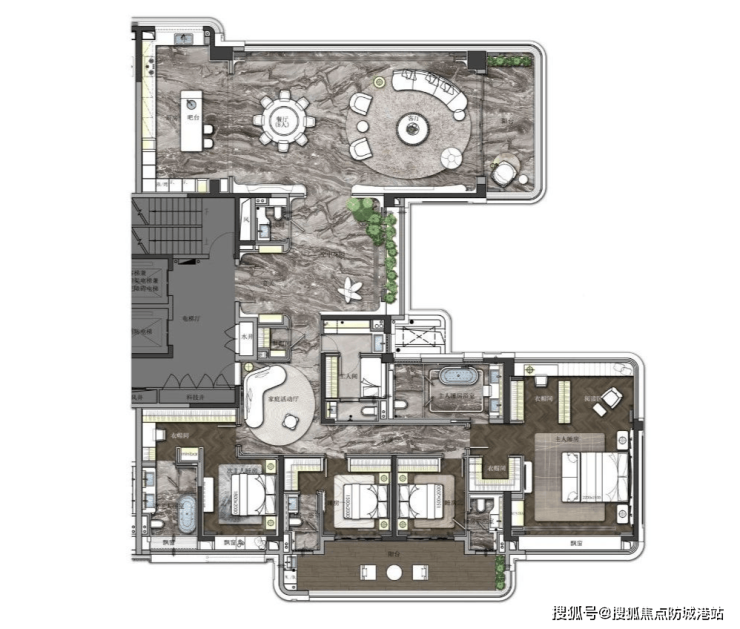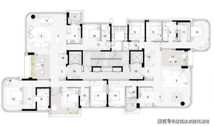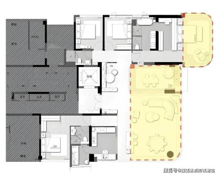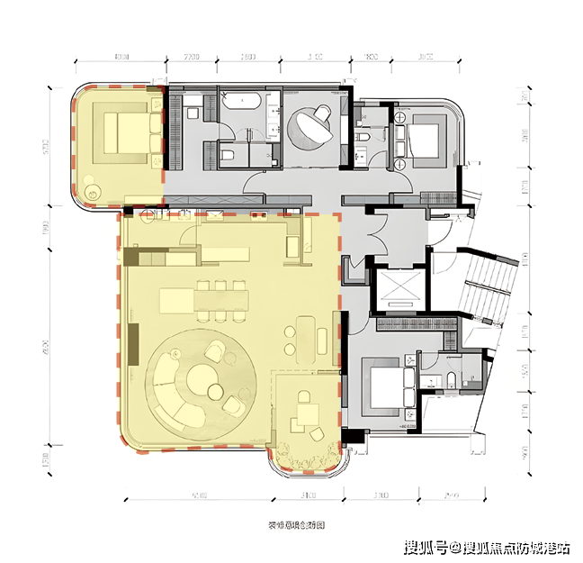 该户型被誉为豪宅户型创新的典范,几乎每个阳角的位置都做成了弧形和玻璃窗。约60㎡的主卧套房和约73㎡的客餐厅都采用的是全景舱设计。北向享受17.6米宽的景观面,南向享受约20米宽的景观面。