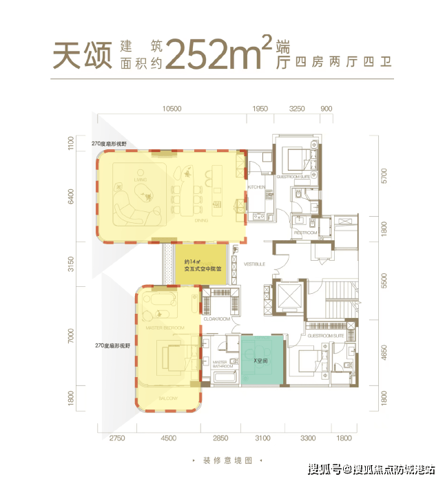 建面约252㎡的端厅户型,三面采光,有两个巨大的全景舱空间,分别是约77㎡的U型悬浮全景聚厅和主卧套。在两大全景舱的中间,是一处约14㎡的交互式空中院馆,可实现主卧、客餐厅两大核心场景的串联。