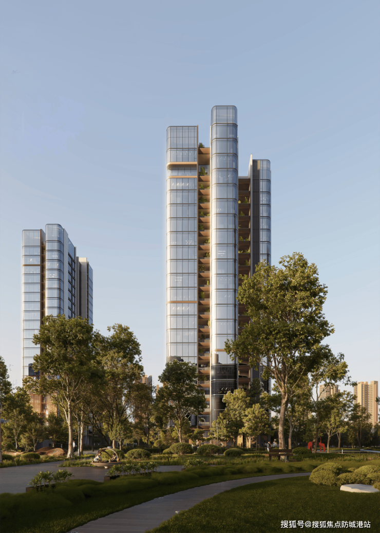 面对复杂的城市界面,建筑设计以“蝶形楼栋+错位扭转”破局,4栋建筑通过精密的角度计算,让每一户实现270°无遮挡视野,充分享受双公园景观。