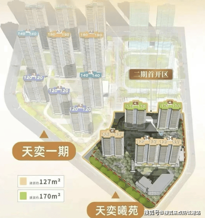 A:主力户型 127㎡、140㎡、170㎡,16-17 层全南向小高层,2 梯 2 户专梯专户,实用率 120%。