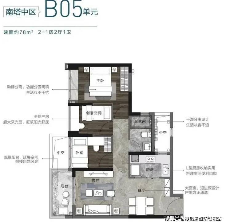 2. 建面约78㎡2+1房两厅一卫(刚需+过渡户型):该户型在两房的基础上,增加了一个灵活空间,可根据家庭需求改造为书房、儿童房或储物间,实用性极强,完美适配刚需向改善过渡的家庭。户型采用一字排开设计,客厅、卧室均朝南,拥有超大采光面,将阳光、清风尽情纳入屋内,整个空间明亮通透,无暗角。客厅连接南向阳台,阳台宽度约1.8米,长度约4米,可作为休闲区、晾晒区,兼顾实用性与观赏性;主卧面积约13㎡,配备独立衣帽间,提升储物空间与私密性;次卧面积约10㎡,灵活实用;灵活空间约6㎡,可根据需求自由改造,满足家庭不同阶段的居住需求。厨房与餐厅相连,动线合理,方便日常烹饪与用餐,卫生间干湿分离,提升使用舒适度。