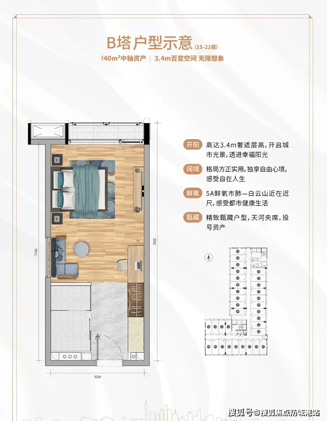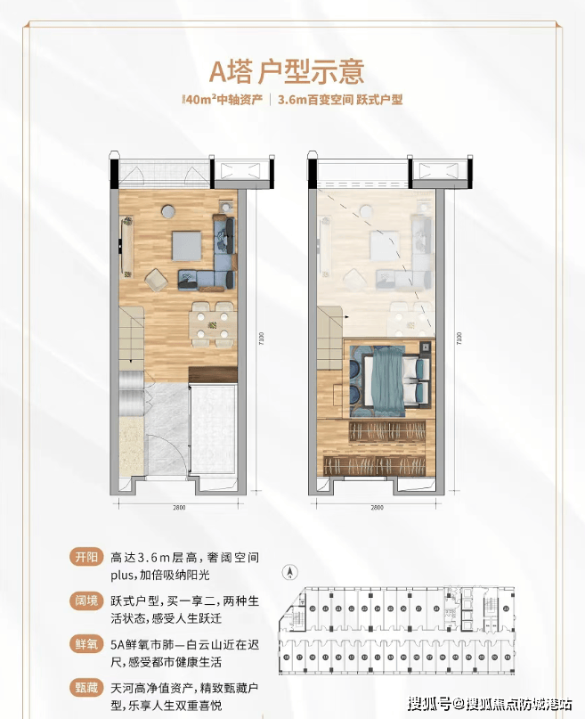 观成大楼:建筑面积约为31-57平方米的中轴资产,采用4.5米高的超高空间设计,提供墅级享受。